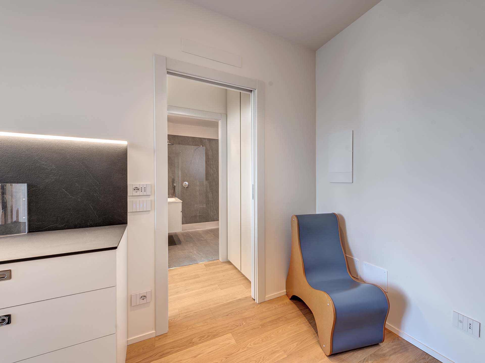 Il bilocale, di circa 60 mq, si compone di un ingresso, un soggiorno con cucina a vista, un disimpegno con angolo lavanderia e una camera da letto con bagno privato dotato di doccia.